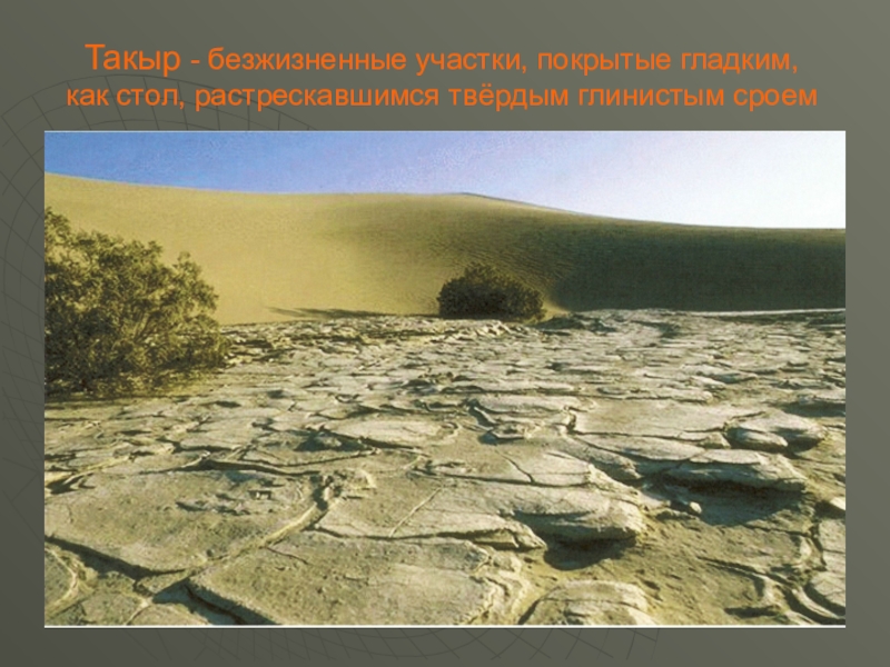 Слайд 13Такыр - безжизненные участки, покрытые гладким, как стол, растрескавшимся твёрдым глинистым