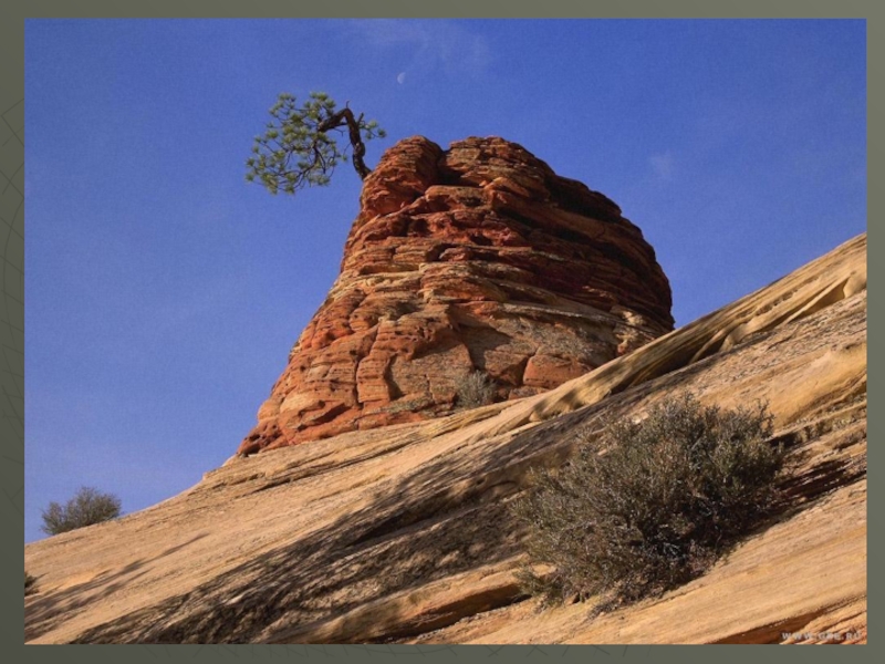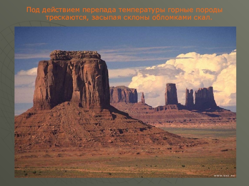 Слайд 9Под действием перепада температуры горные породы трескаются, засыпая склоны обломками скал.