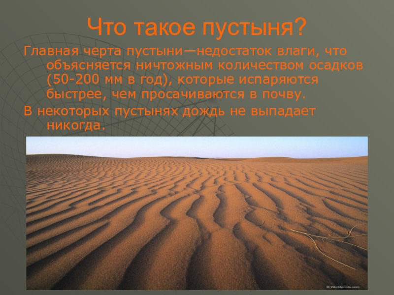 Что такое пустыня?Главная черта пустыни—недостаток влаги, что объясняется ничтожным количеством осадков (50-200 мм в год), которые испаряются