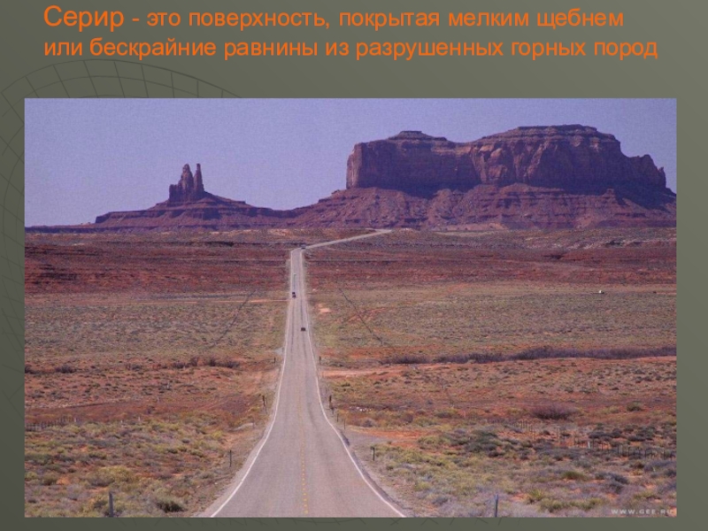 Слайд 12Серир - это поверхность, покрытая мелким щебнем или бескрайние равнины из