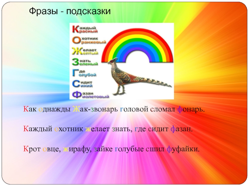 Принято считать, что в радуге семь цветов, чтобы легче было запомнить, придумали фразы подсказки.