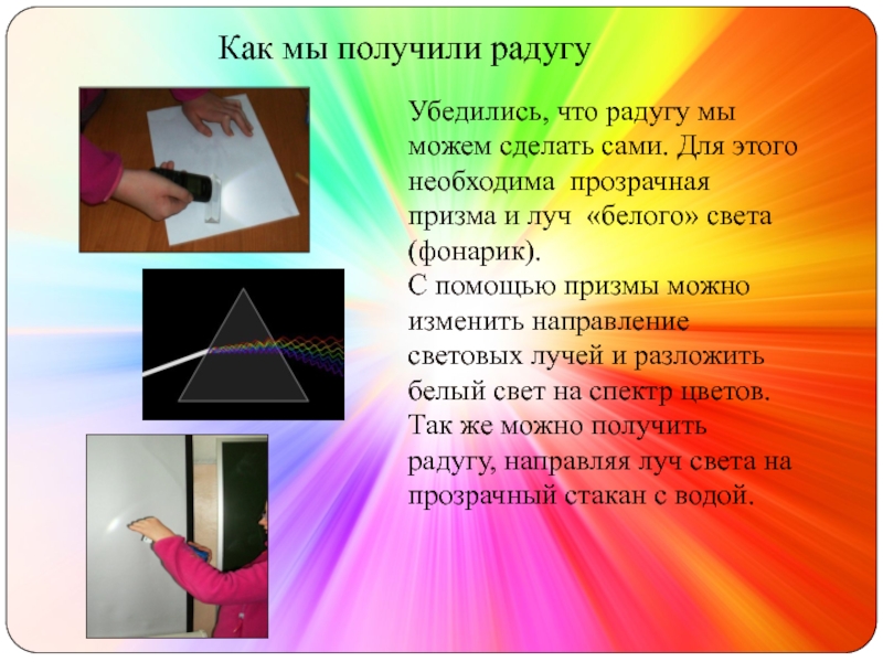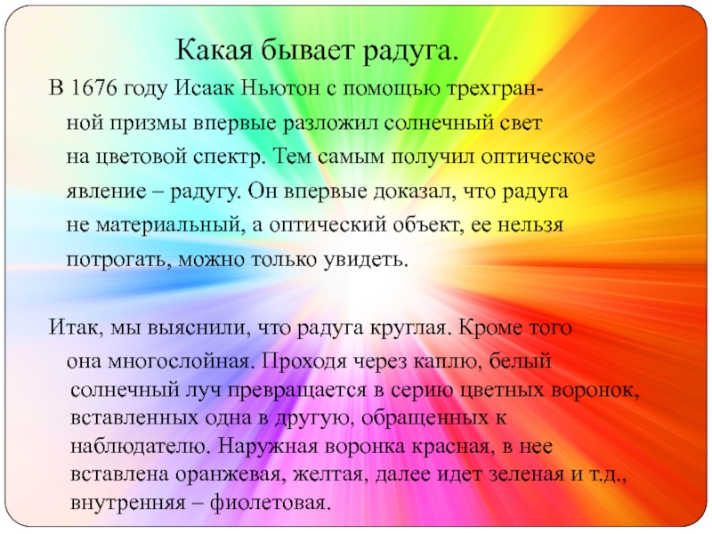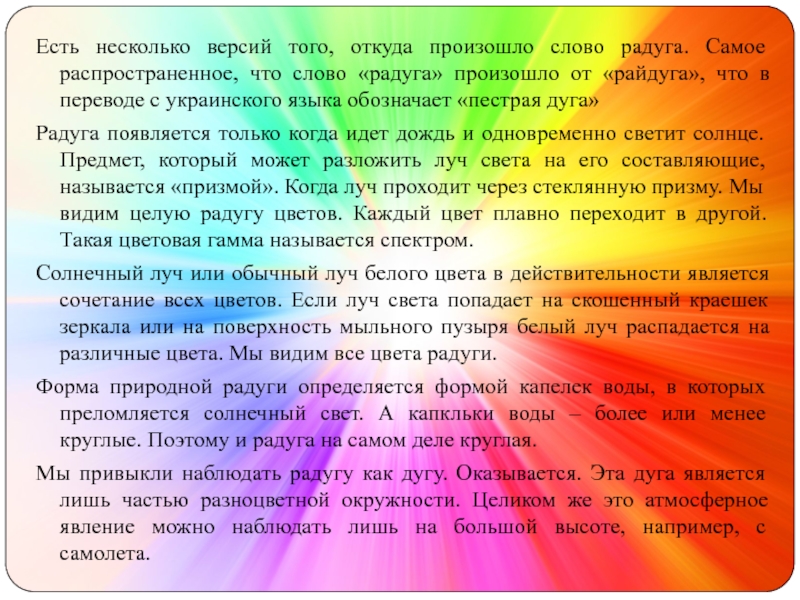 Радуга появляется только когда идет дождь и одновременно светит солнце. Предмет, который может разложить луч света на его составляющие, называется «призмой». Когда луч проходит через стеклянную призму. Мы видим целую радугу цветов. Каждый цвет плавно переходит в другой. Такая цветовая гамма называется спектром.