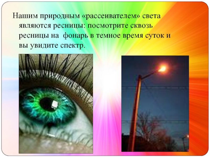 Слайд 20Нашим природным «рассеивателем» света являются ресницы: посмотрите сквозь ресницы на фонарь