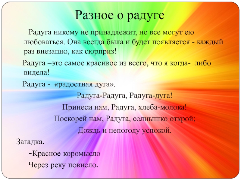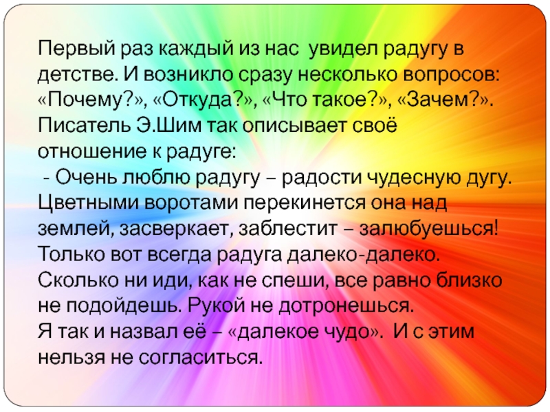 сразу несколько вопросов: «Почему?», «Откуда?», «Что такое?», «Зачем?». Писатель Э.Шим так описывает своё отношение к радуге: