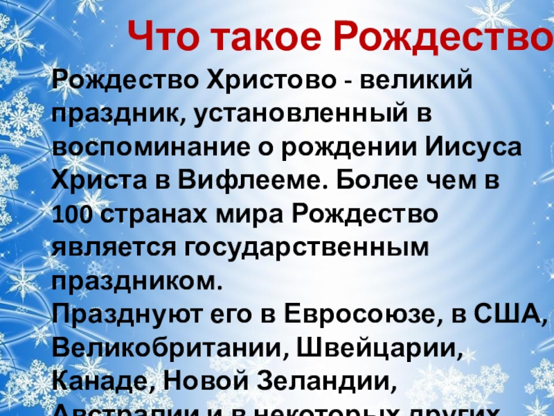 в воспоминание о рождении Иисуса Христа в Вифлееме. Более чем в 100 странах мира Рождество является государственным праздником.