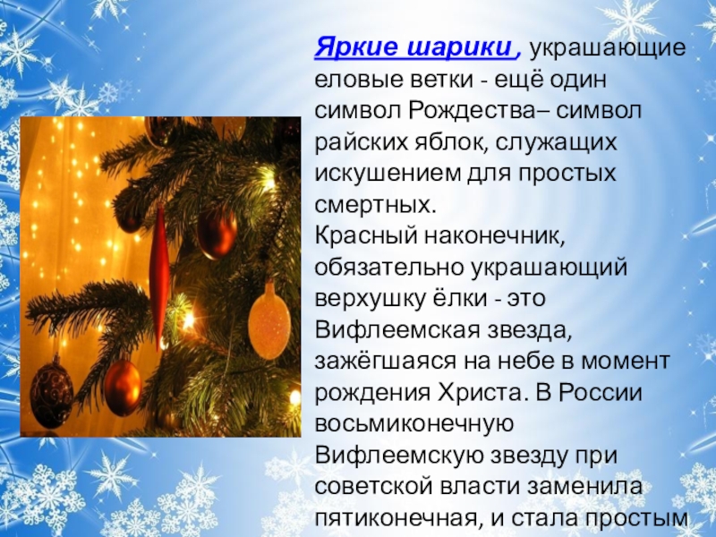 Яркие шарики , украшающие еловые ветки - ещё один символ Рождества–