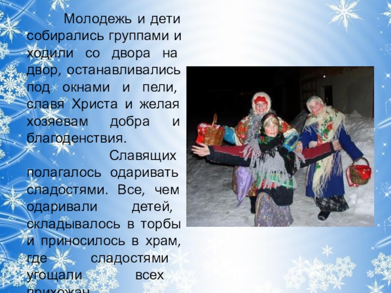 со двора на двор, останавливались под окнами и пели, славя Христа и желая хозяевам добра и благоденствия.
