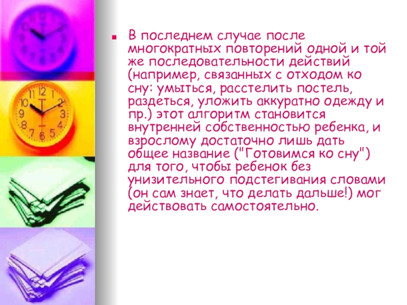 действий (например, связанных с отходом ко сну: умыться, расстелить постель, раздеться, уложить аккуратно одежду и пр.) этот алгоритм становится внутренней собственностью ребенка, и взрослому достаточно лишь дать общее название ("Готовимся ко сну") для того, чтобы ребенок без унизительного подстегивания словами (он сам знает, что делать дальше!) мог действовать самостоятельно.