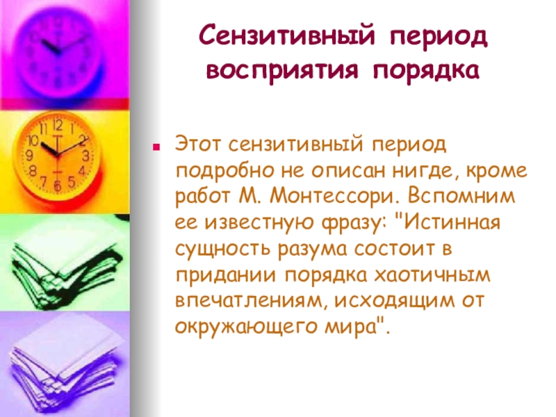работ М. Монтессори. Вспомним ее известную фразу: "Истинная сущность разума состоит в придании порядка хаотичным впечатлениям, исходящим от окружающего мира".