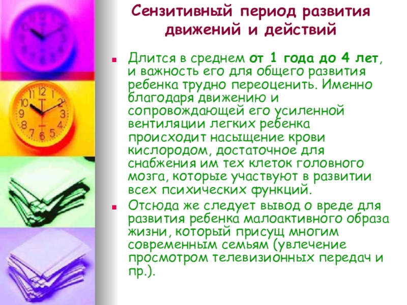 до 4 лет, и важность его для общего развития ребенка трудно переоценить. Именно благодаря движению и сопровождающей его усиленной вентиляции легких ребенка происходит насыщение крови кислородом, достаточное для снабжения им тех клеток головного мозга, которые участвуют в развитии всех психических функций.