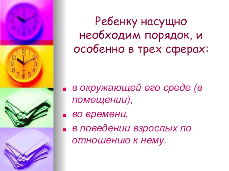 Слайд 15Ребенку насущно необходим порядок, и особенно в трех сферах: