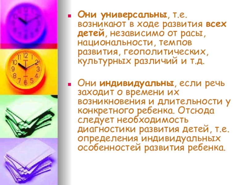 Они индивидуальны, если речь заходит о времени их возникновения и длительности у конкретного ребенка. Отсюда следует необходимость диагностики развития детей, т.е. определения индивидуальных особенностей развития ребенка.