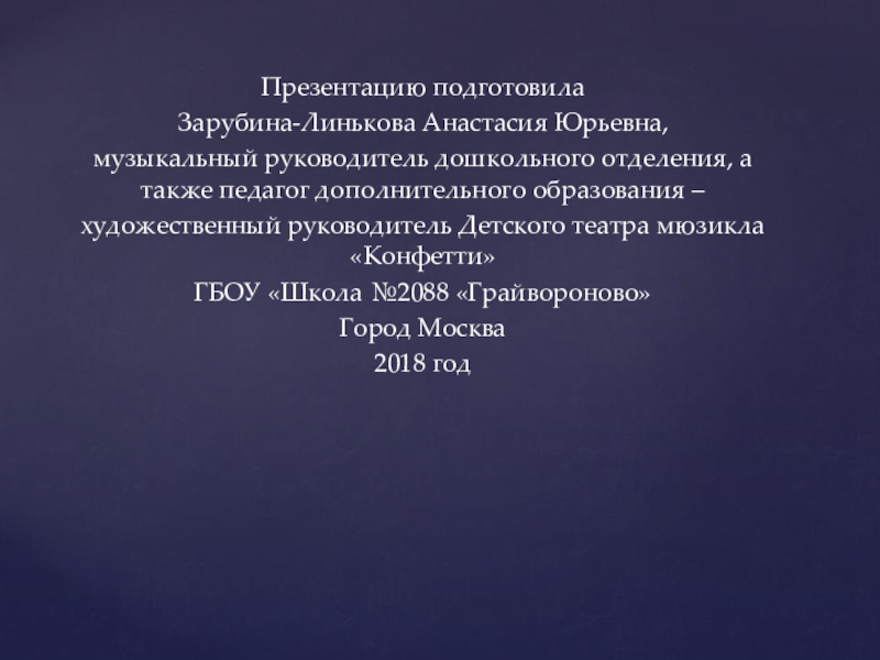 Презентацию подготовила Зарубина-Линькова Анастасия Юрьевна, музыкальный руководитель дошкольного отделения, а также педагог дополнительного образования –художественный руководитель Детского