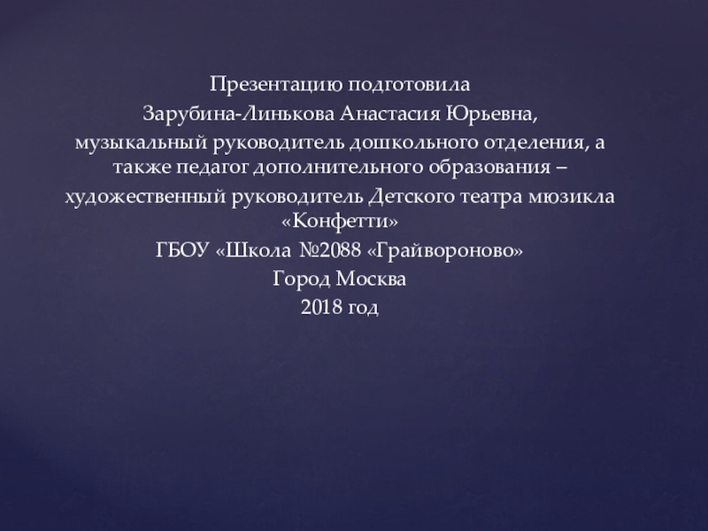 Презентацию подготовила Зарубина-Линькова Анастасия Юрьевна, музыкальный руководитель дошкольного отделения, а также педагог дополнительного образования –художественный руководитель Детского