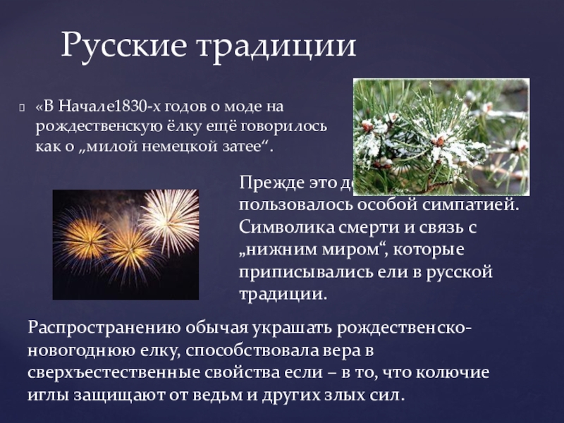 Прежде это дерево... не пользовалось особой симпатией. Символика смерти и связь с „нижним миром“, которые приписывались ели в русской традиции.