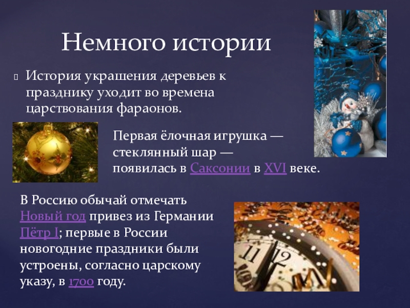 В Россию обычай отмечать Новый год привез из Германии Пётр I; первые в России новогодние праздники были устроены, согласно царскому указу, в 1700 году.