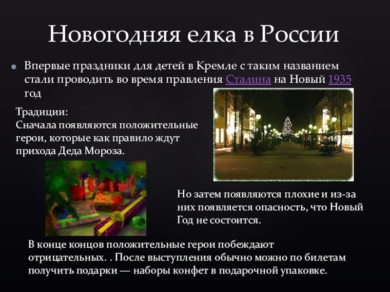 В конце концов положительные герои побеждают отрицательных. . После выступления обычно можно по билетам получить подарки — наборы конфет в подарочной упаковке.