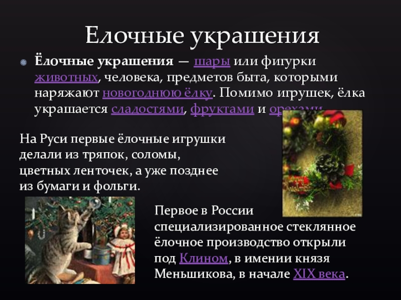 Первое в России специализированное стеклянное ёлочное производство открыли под Клином, в имении князя Меньшикова, в начале XIX века.