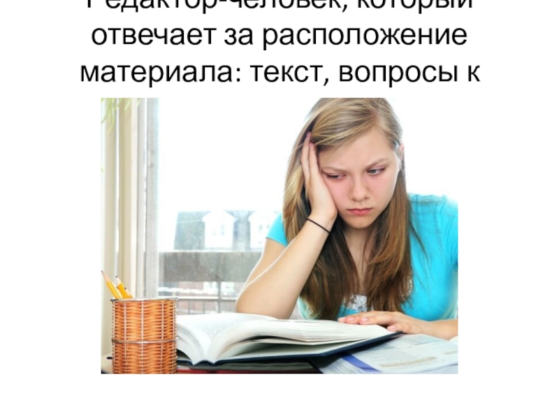 Слайд 20Редактор-человек, который отвечает за расположение материала: текст, вопросы к текстам, иллюстрации…
