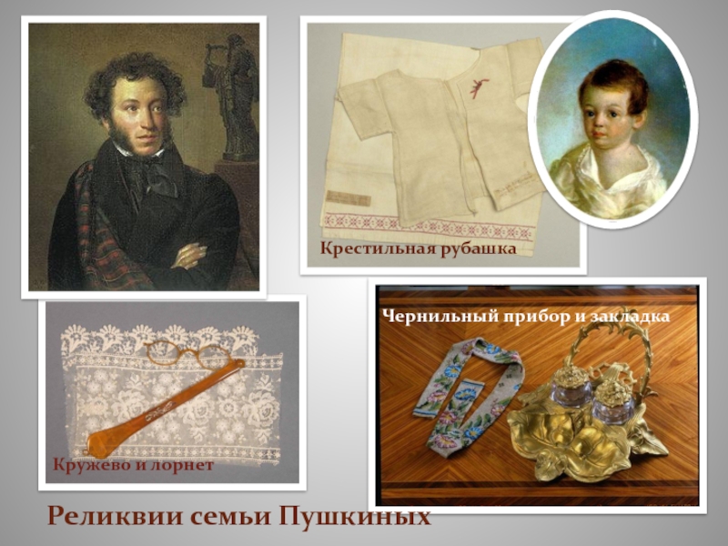 Реликвии семьи ПушкиныхКрестильная рубашка Кружево и лорнетЧернильный прибор и закладка
