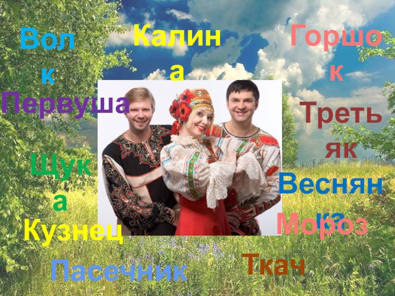 КалинаГоршокПервушаВолкВеснянкаМорозЩукаТретьякКузнецПасечникТкач