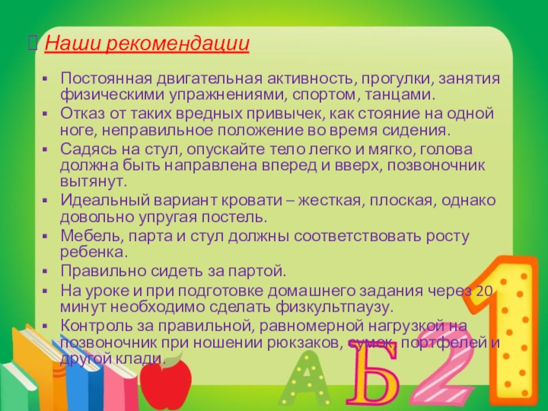 Правильная осанка зависит от нормального развития позвоночника. Нарушение позвоночника – понятие, означающее различное искривление позвоночника. Наиболее частой деформацией позвоночника у детей является сколеоз.