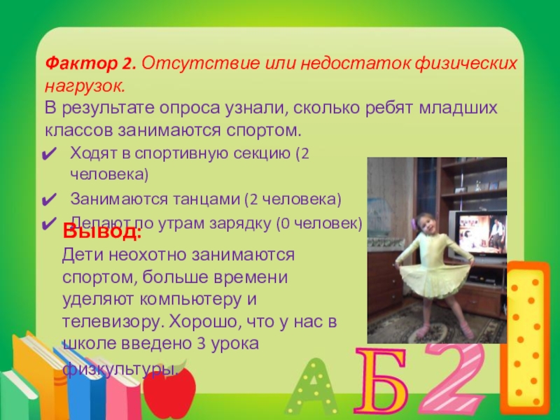 Дети неохотно занимаются спортом, больше времени уделяют компьютеру и телевизору. Хорошо, что у нас в школе введено 3 урока физкультуры.