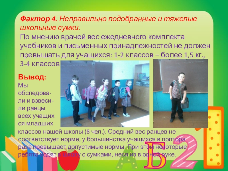 классов нашей школы (8 чел.). Средний вес ранцев не соответствует норме, у большинства учащихся в полтора раза превышает допустимые нормы. При этом некоторые ребята ходят в школу с сумками, неся из в одной руке.