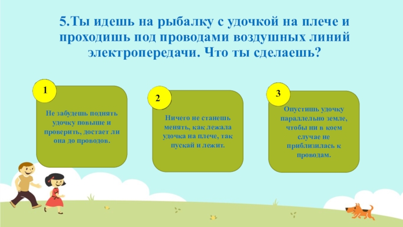Опустишь удочку параллельно земле, чтобы ни в коем случае не приблизилась к проводам.