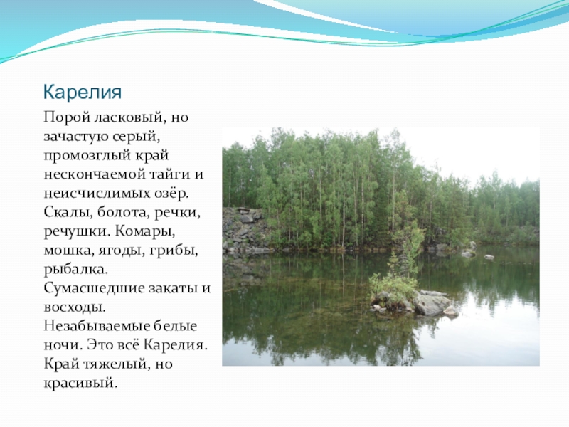 озёр. Скалы, болота, речки, речушки. Комары, мошка, ягоды, грибы, рыбалка. Сумасшедшие закаты и восходы. Незабываемые белые ночи. Это всё Карелия. Край тяжелый, но красивый.