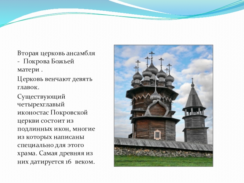 Слайд 12Вторая церковь ансамбля - Покрова Божьей матери .