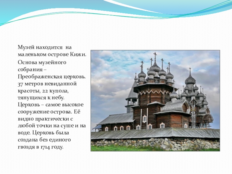 37 метров невиданной красоты, 22 купола, тянущихся к небу. Церковь – самое высокое сооружение острова. Её видно практически с любой точки на суше и на воде. Церковь была создана без единого гвоздя в 1714 году.