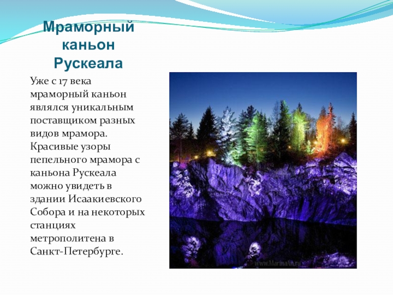 Красивые узоры пепельного мрамора с каньона Рускеала можно увидеть в здании Исаакиевского Собора и на некоторых станциях метрополитена в Санкт-Петербурге.