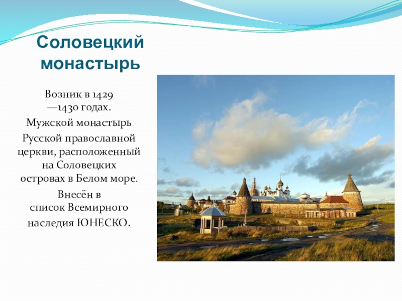 Русской православной церкви, расположенный на Соловецких островах в Белом море.