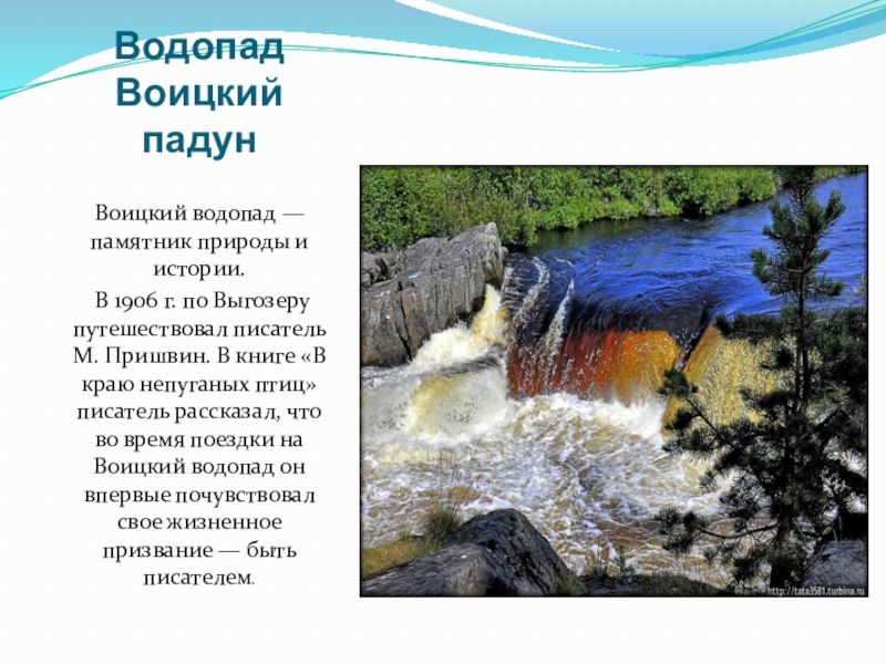 г. по Выгозеру путешествовал писатель М. Пришвин. В книге «В краю непуганых птиц» писатель рассказал, что во время поездки на Воицкий водопад он впервые почувствовал свое жизненное призвание — быть писателем.