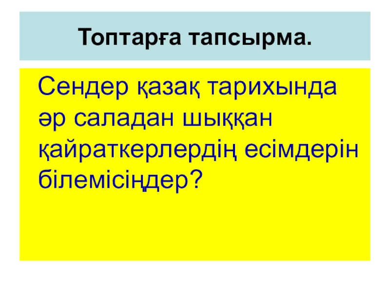 Топтарға тапсырма.  Сендер қазақ тарихында әр саладан шыққан қайраткерлердің есімдерін білемісіңдер?