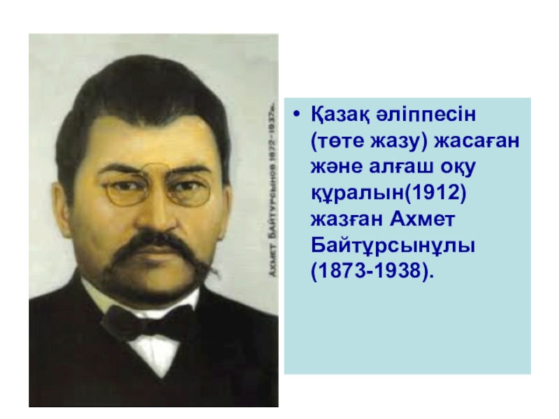 Қазақ әліппесін (төте жазу) жасаған және алғаш оқу құралын(1912) жазған Ахмет Байтұрсынұлы (1873-1938).