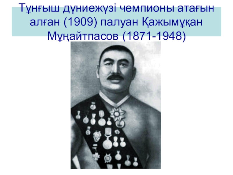 Слайд 7Тұнғыш дүниежүзі чемпионы атағын алған (1909) палуан Қажымұқан Мұңайтпасов (1871-1948)