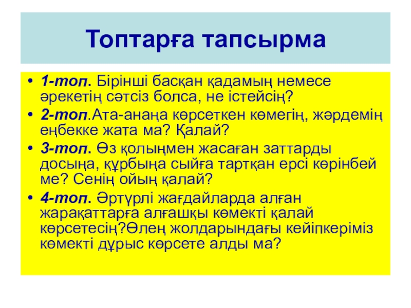 Топтарға тапсырма1-топ. Бірінші басқан қадамың немесе әрекетің сәтсіз болса, не істейсің?2-топ.Ата-анаңа көрсеткен көмегің, жәрдемің еңбекке жата ма?
