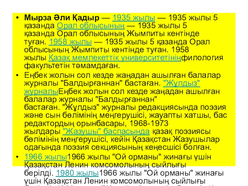 Мырза Әли Қадыр — 1935 жылы — 1935 жылы 5 қазанда Орал облысының — 1935 жылы 5 қазанда Орал облысының Жымпиты кентінде туған. 1958 жылы — 1935 жылы 5 қазанда Орал облысының Жымпиты кентінде