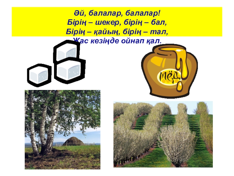 Әй, балалар, балалар! Бірің – шекер, бірің – бал, Бірің – қайың, бірің – тал, Жас кезіңде ойнап қал.