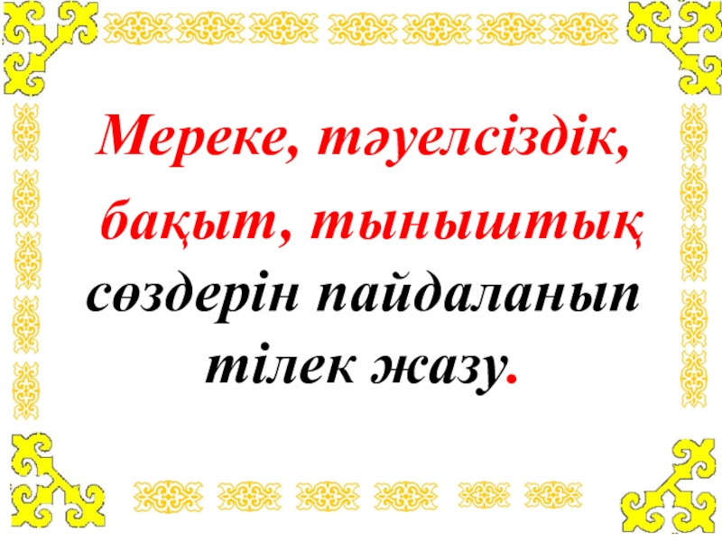 Мереке, тәуелсіздік, бақыт, тыныштық сөздерін пайдаланып тілек жазу.