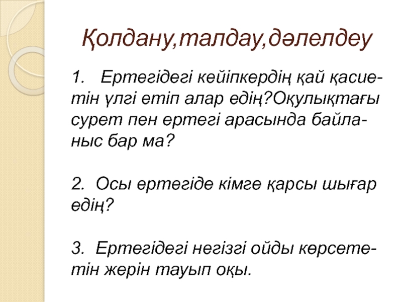 Қолдану,талдау,дәлелдеу1.  Ертегідегі кейіпкердің қай қасие- тін үлгі етіп алар едің?Оқулықтағы сурет пен ертегі арасында