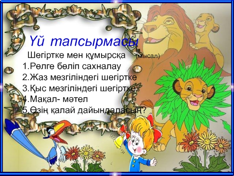 Үй тапсырмасы  Шегіртке мен құмырсқа  (мысал)1.Рөлге бөліп сахналау 2.Жаз мезгіліндегі шегіртке3.Қыс мезгіліндегі шегіртке4.Мақал- мәтел5.Өзің