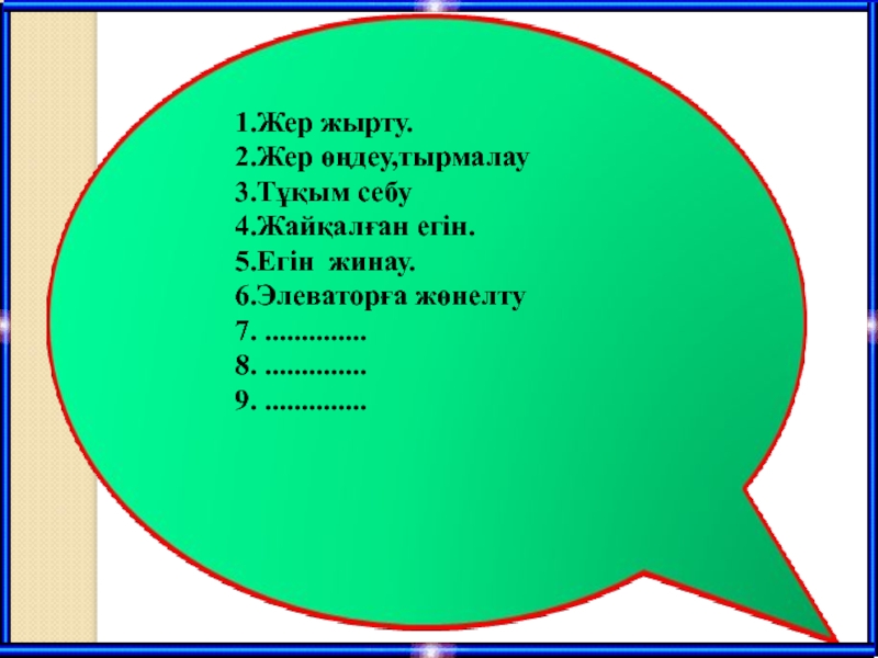 Слайд 161.Жер жырту. 2.Жер өңдеу,тырмалау 3.Тұқым себу 4.Жайқалған егін. 5.Егін жинау. 6.Элеваторға жөнелту 7. .............. 8. .............. 9. ..............