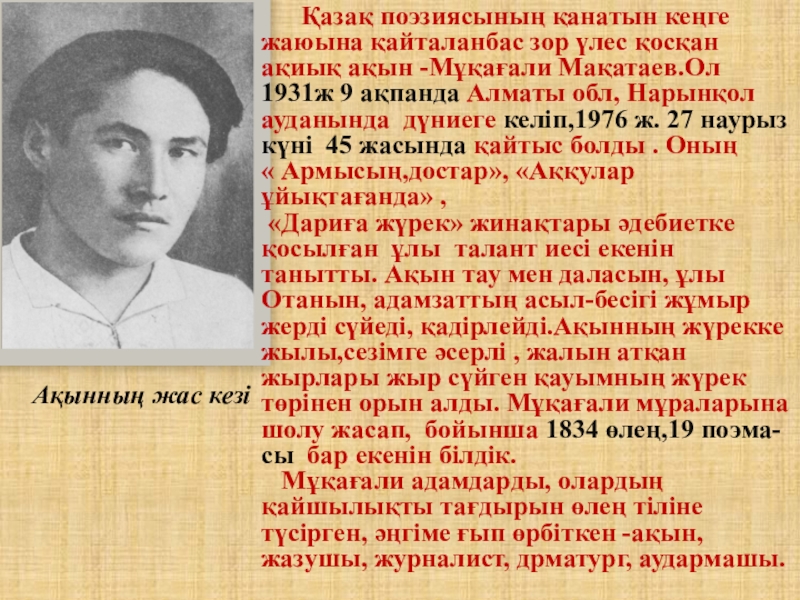 зор үлес қосқан ақиық ақын -Мұқағали Мақатаев.Ол 1931ж 9 ақпанда Алматы обл, Нарынқол ауданында дүниеге келіп,1976 ж. 27 наурыз күні 45 жасында қайтыс болды . Оның « Армысың,достар», «Аққулар ұйықтағанда» ,