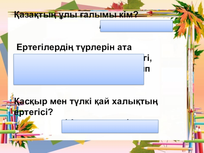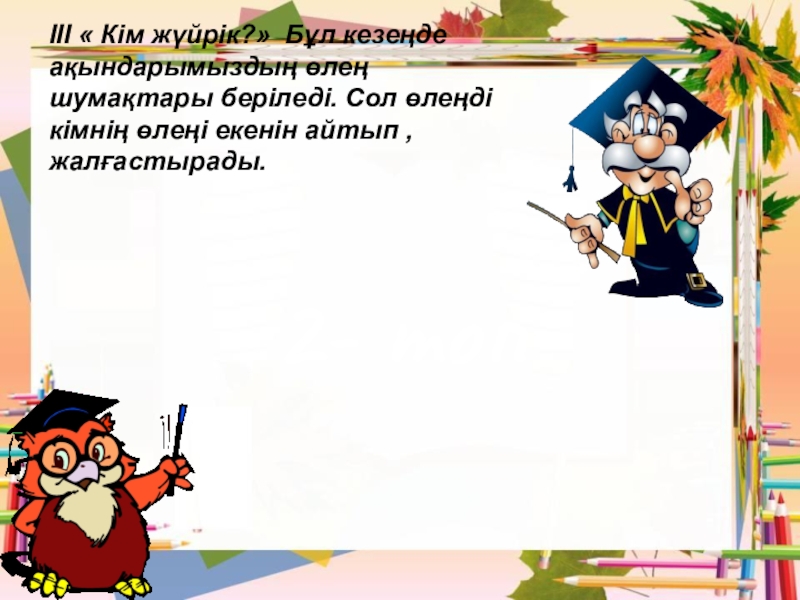 І « Кім білгір?» сұрақтарға жауап беру. ІІ Ойлан, тап» Бұл кезеңде ұлы ақын - жазушыларымыздың шығармаларынан
