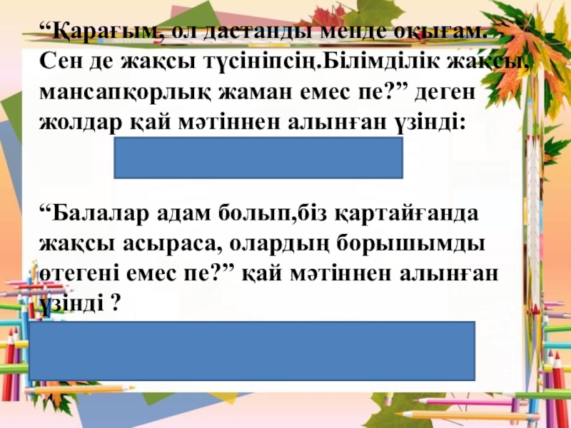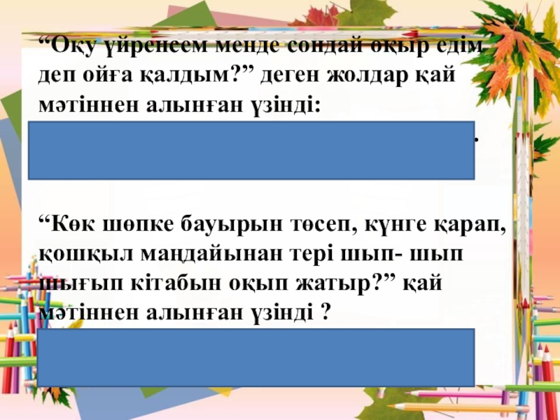 Слайд 13“Оқу үйренсем менде сондай оқыр едім деп ойға қалдым?” деген жолдар