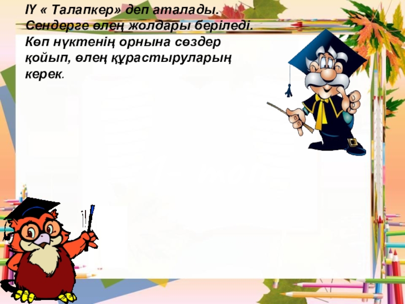 ІҮ. «Талапкер» деп аталады. Сендерге өлең жолдары беріледі. Көп нүктенің орнына сөздер қойып, өлең құрастыруларың керек. V «Көнерген сөздер» берілген сөздердің мағынасын ашып түсіндіру.