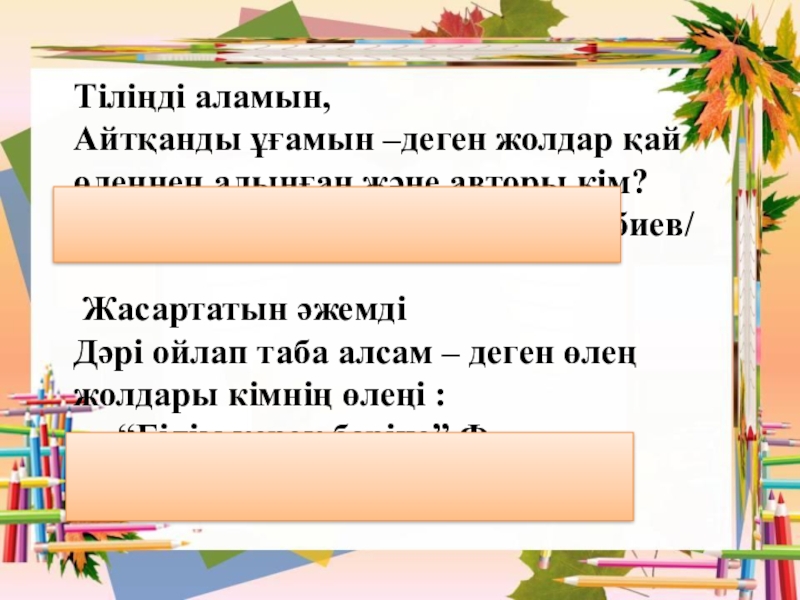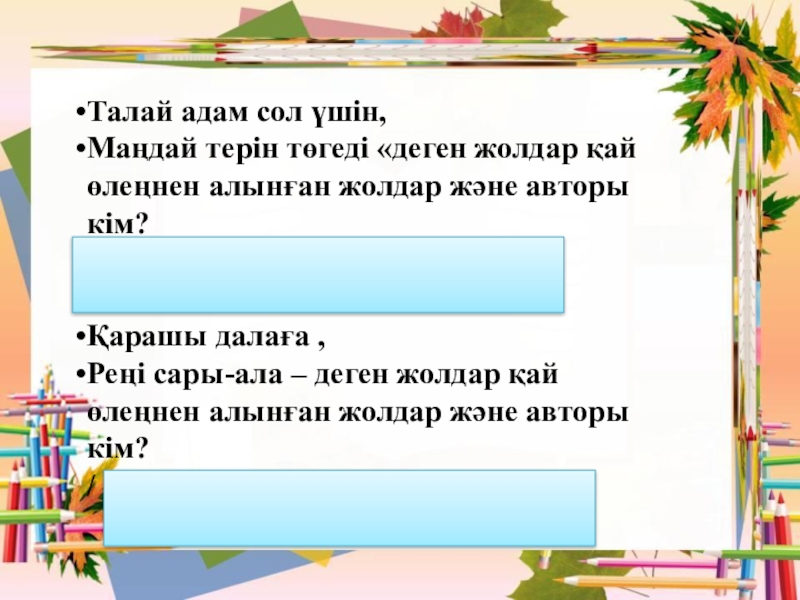 Сол өлеңді кімнің өлеңі екенін айтып , жалғастырады.